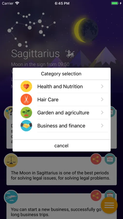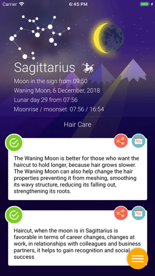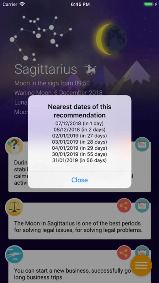 For your convenience we’ve integrated the feature of calculation of the nearest days with the detailed description. All recommendations are based upon multiple parameters, such as the moon in a certain zodiacal sign, the moon phase, the lunar day, etc.