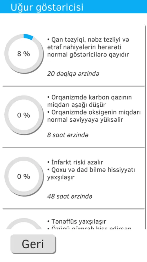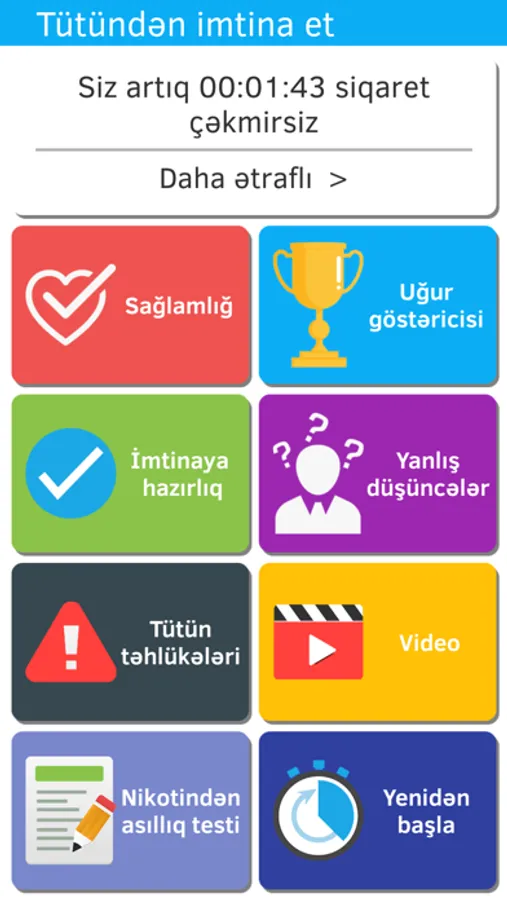 Bundan sonra, proqram sizin tütünçəkmədən imtina müddətinizi, çəkmədiyiniz siqaretlərin sayını, qənaət etdiyiniz vaxtızı və pulunuzu göstərəcəkdir.