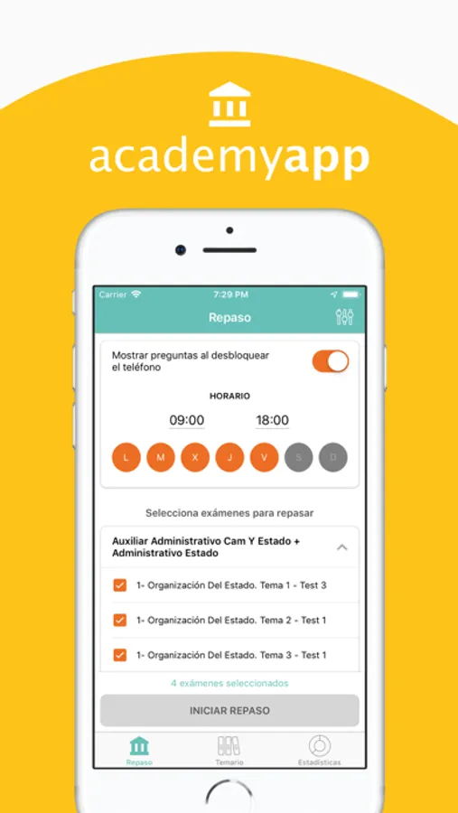 Saca provecho de las distracciones causadas por tu móvil con AcademyApp y recibe una pregunta de examen cada vez que desbloquees tu teléfono. Las podrás contestar de manera fácil y rápida sin necesidad de abrir la aplicación, y además, seguir de cerca tu evolución con las estadísticas que AcademyApp te ofrece.