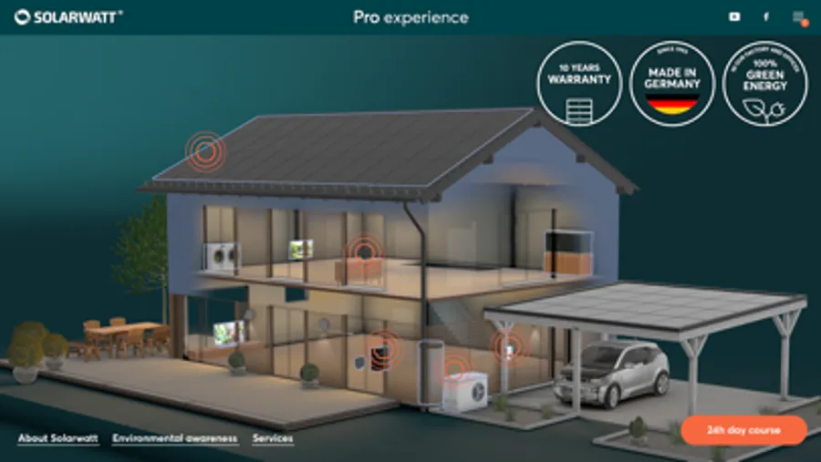 In an interactive 3D environment, you can discover photovoltaic products and get an impression of an optimal interaction of solar modules, energy management, energy storage, heat pump and ev-charger.