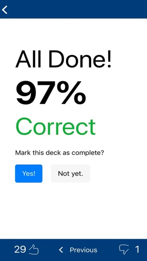 Directions: Tap to flip the card to see the term or definition. Swipe left if you miss it; swipe right if you got it! Go back to previous terms in the deck if you swiped the wrong way or if you need to review a term again. Mark decks complete once you feel comfortable with your knowledge. See your last score on each deck from the home screen to track your progress!