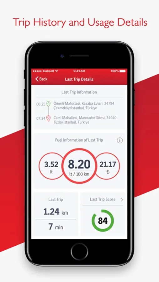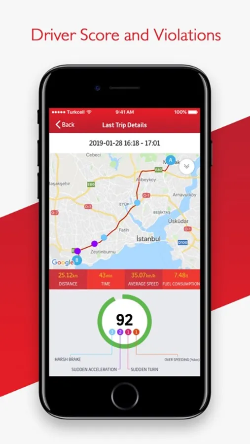 Display details of your trip; Show you how many kilometers you have driven, how much time you have spent and your driving score.