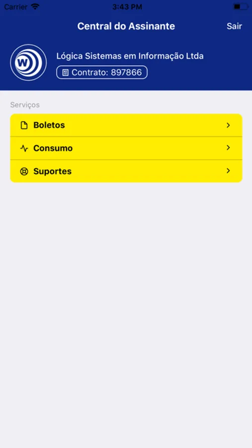 A WSAT Connection de uso do aplicativo Central do Assinante disponibiliza os seguintes recursos: