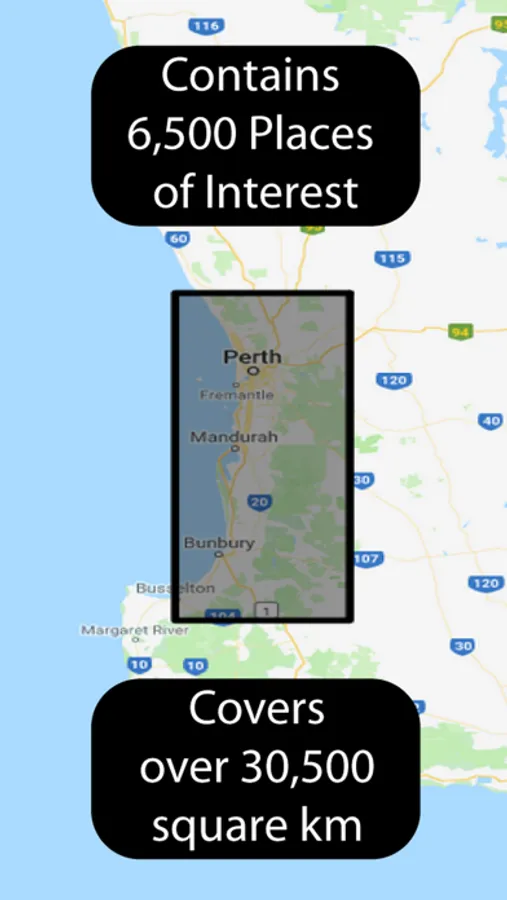 This version for Perth, Western Australia, locates places around the city and surrounding coastal region, extending northwards past Joondalup and southwards to Bunbury on the coast and inland as far as the Mundaring State Forest. This is an area of nearly 12,000 sq miles (30,500 km2) all within one App.