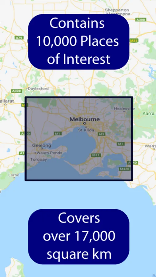 This version for Melbourne, Victoria, Australia, locates places around the city and surrounding region, extending northwards inland to Gisborne and southwards to Phillip Island on the coast, encompassing the whole Port Phillip Bay and down to Anglesea on the Great Ocean Road. This is an area of nearly 1,600 sq miles (4,000 km2) all within one App.