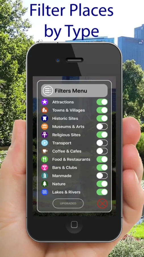 Categories that can be viewed and selected include major Attractions, Hills, Lakes, Parks & Woodlands, Cities, Towns, Suburban Areas, Villages & Hamlets, Cafes, Restaurants, Cafes, Airports, Train & Major Bus Stations, Municipal Buildings, Places of Worship, Historic Sites and Museums & Arts.