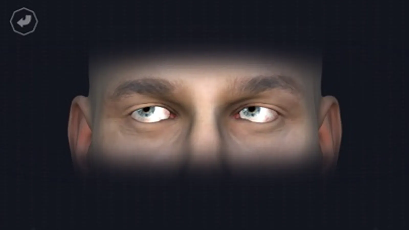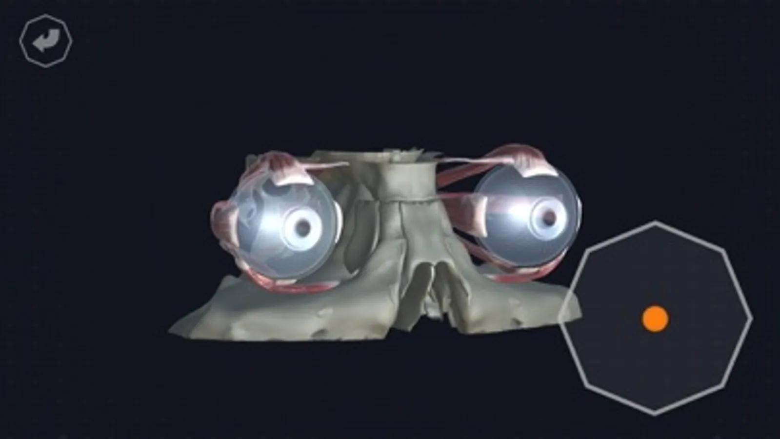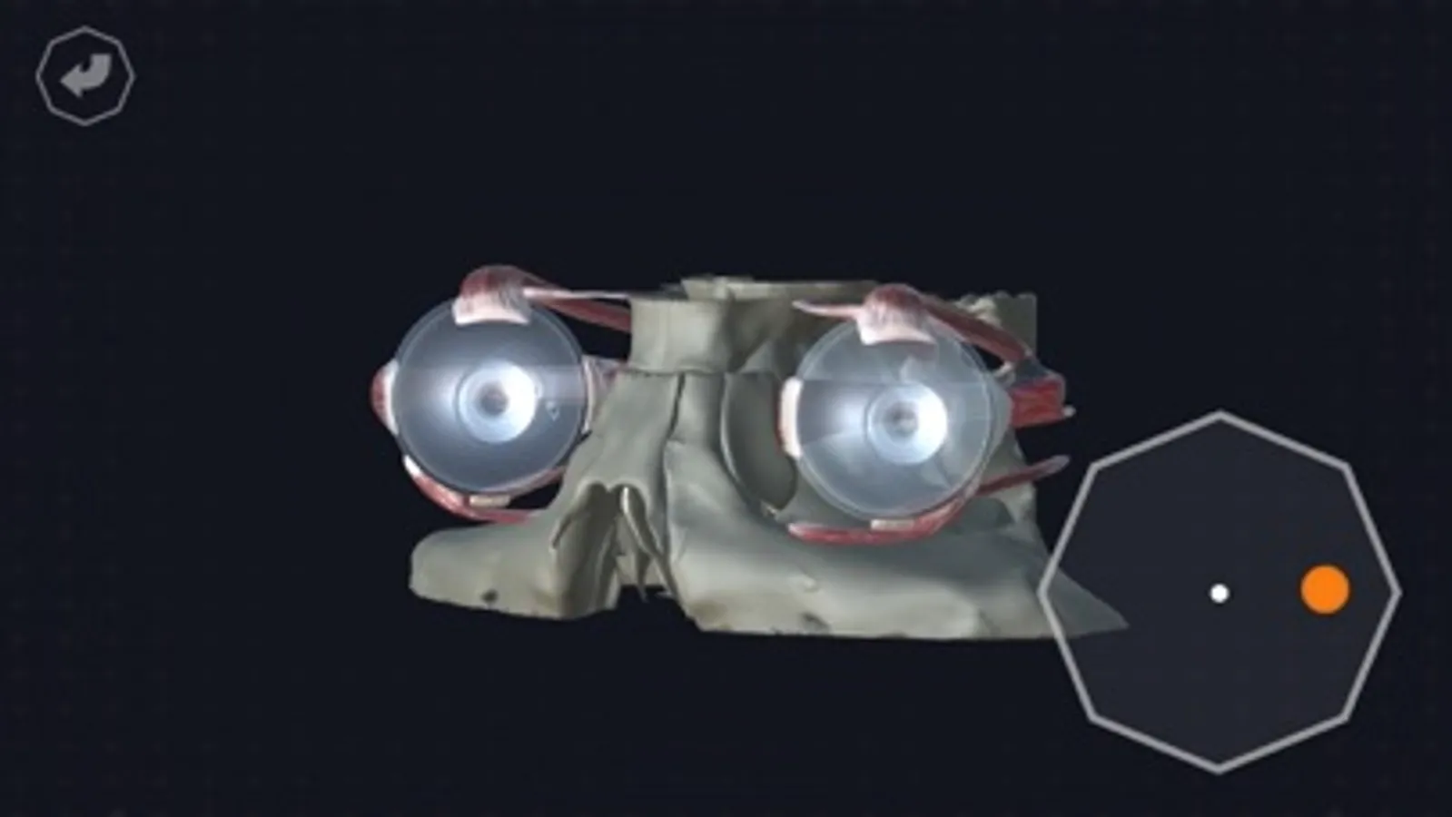 To view the 3D eye model, use the leftmost button on the bottom bar. You can rotate and zoom in this mode, and you can control where the eyes look using the joystick controller to the right. You can also interact with individual muscles to further see how each works.