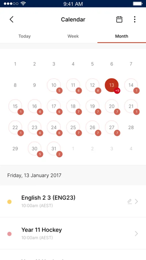 Calendar: the Calendar provides parents, teachers and students a personalised view of what's coming up for the day or in the future. Students can also receive reminders when the due date for their work is approaching