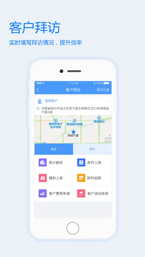 ● 到店签到:拜访客户,可直接进行位置签到,填写拜访总结,上传终端陈列照片,提升公司管理效率和提供监管指导依据。