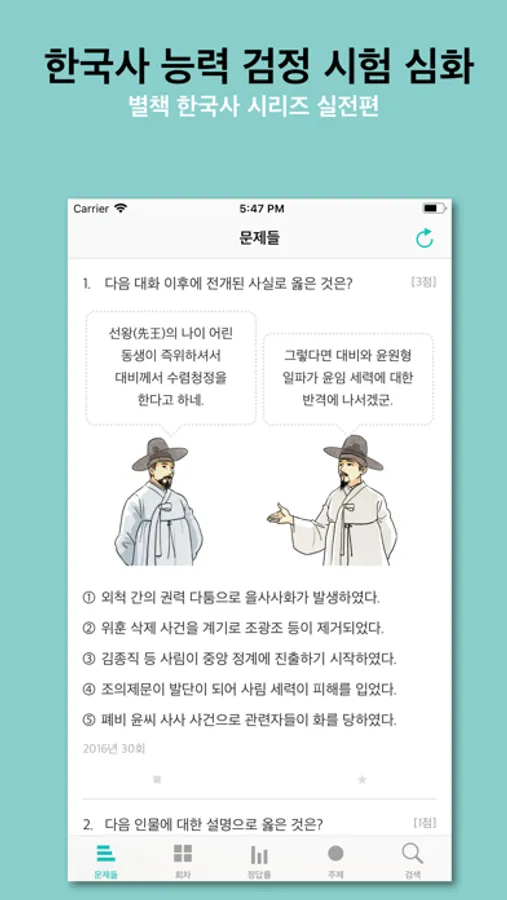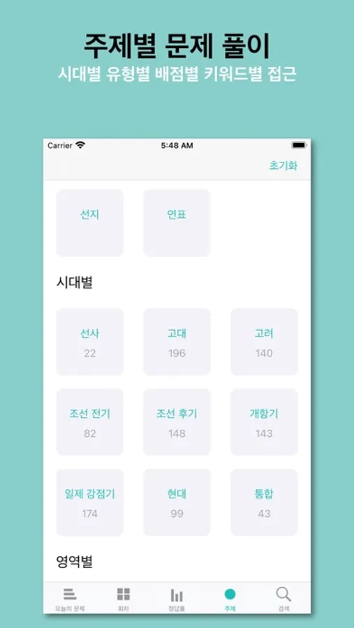 시대별 영역별 주제별 문제 풀이는 물론 특정 키워드별로 분류된 문제들만 따로 풀 수 있도록 체계화했습니다.