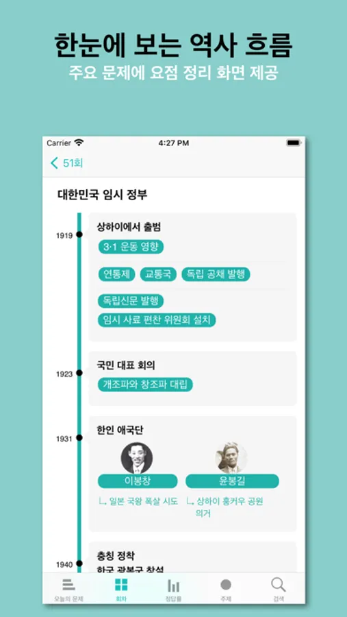 역사의 흐름을 한눈에 파악할 수 있는 요점 정리 화면을 제공합니다.