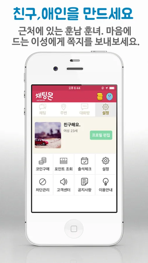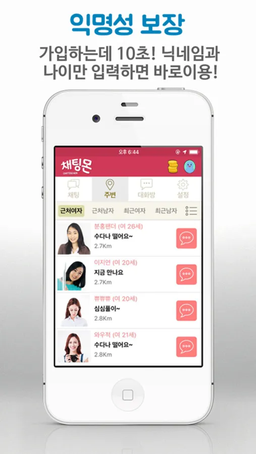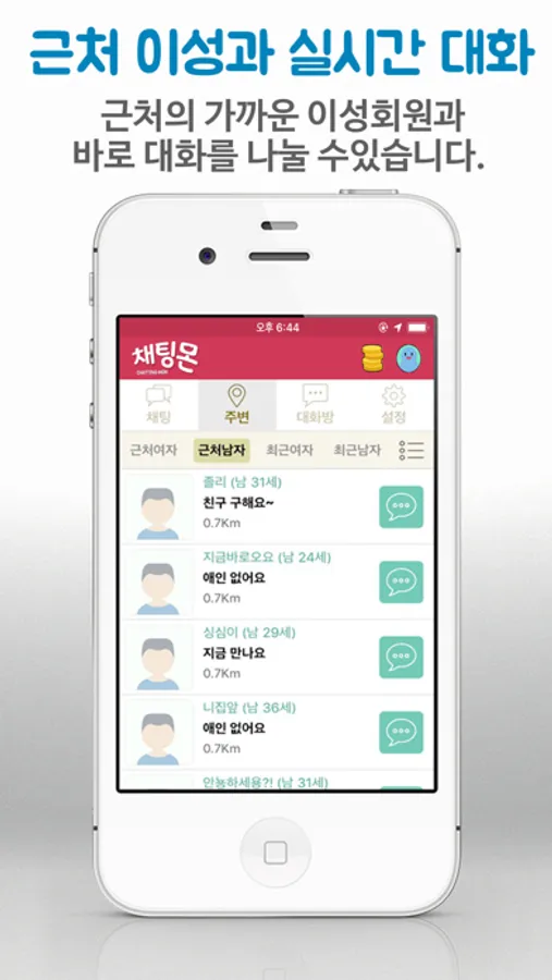 채팅 목록에서 거리가 가까운 상대방에게 쪽지를 보내어 즐거운 만남을 할 수 있습니다.