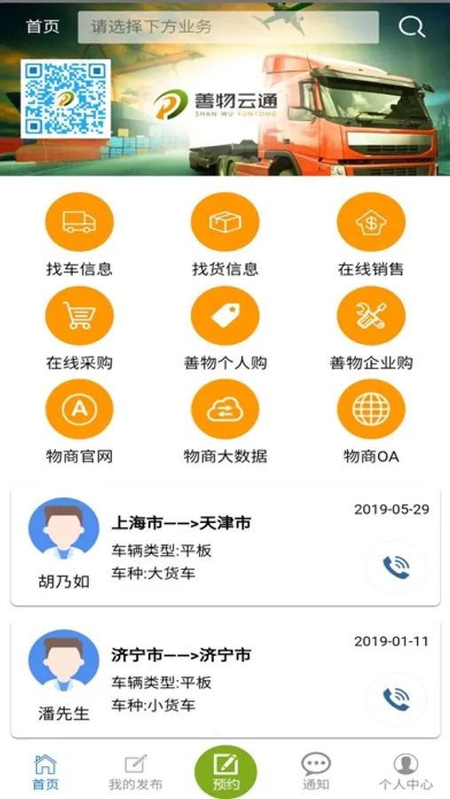 通过善物云通APP实现车辆预约货物配送一体化、需求发布信息接收时时性。主要功能包括会员中心,在线预约入园功能,在线发布需求功能(我要采购功能、我要销售功能、我要找车功能、我要找货功能),信息展示功能(联系我们、服务中心、联系方式等),消息推动功能等。