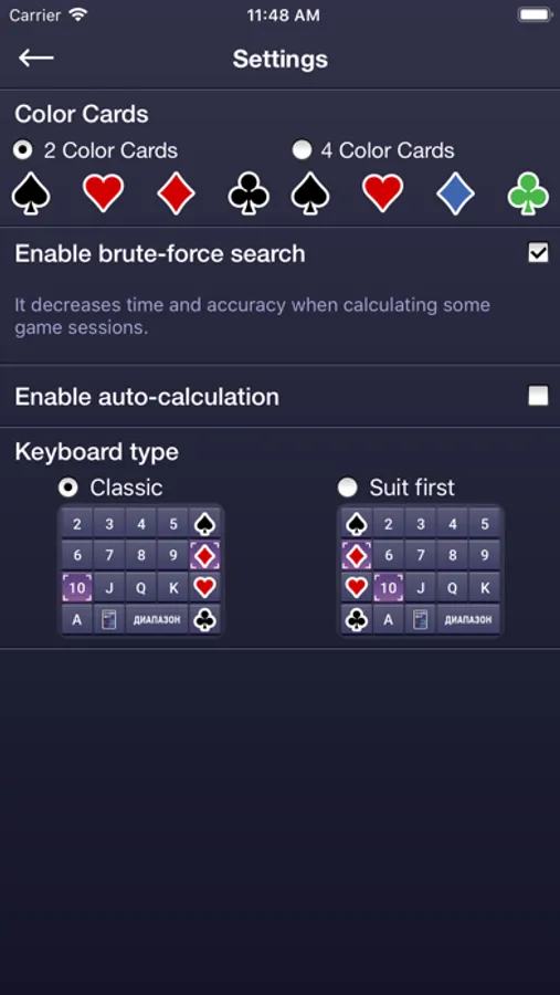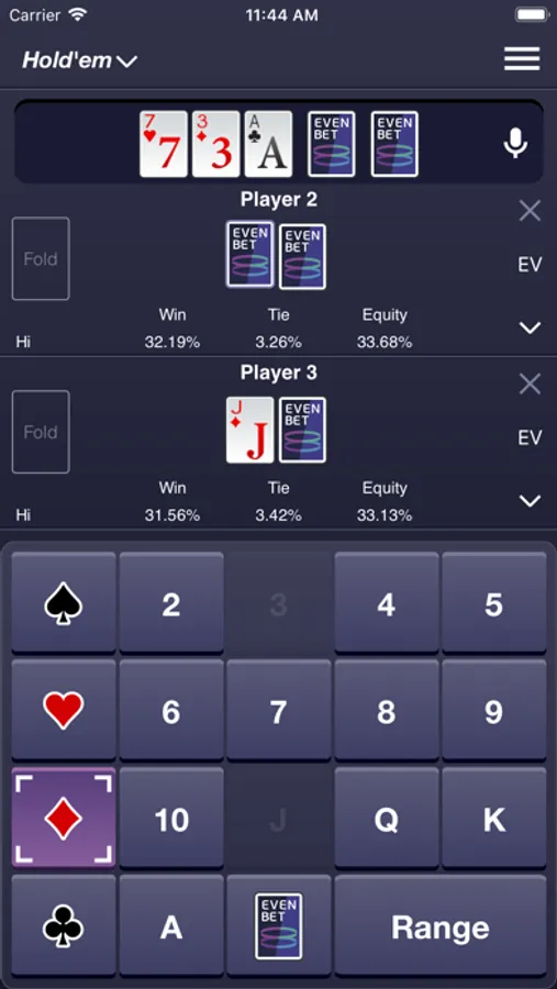 * Quick cards’ input and instant calculation at any stage of the game from pre-flop up to river