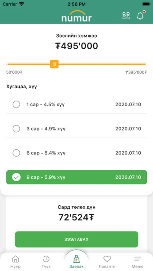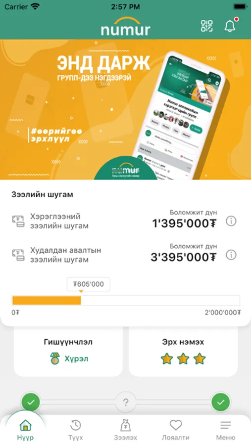 Та Нөмөрийн хувийн зээлийн шугамаас өөрийнхөө нөхцөлд тохируулан зээл авах боломжтой. Хувийн зээлийн шугам (Personal Line of Credit) гэдэг нь хэзээ ч, хаанаас ч, хэдэн ч удаа 2 сая төгрөг хүртэлхи дүн бүхий өөрийн зээлийн шугам/эрхээс авч сонгосон хугацаандаа тогтмол хуваарьтай эргэн төлөх зээлийн үйлчилгээ юм.