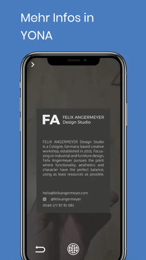 Belebe deine Umwelt ohne in sie einzugreifen. YONA ist dein Assistent, die komplexen Möglichkeiten der erweiterten Realität einfach zu nutzen. Aktuell, interaktiv und unmittelbar visualisiert die Whitelable-App über den Smartphone-Bildschirm Videos und 3D-Objekte auf Visitenkarten, Plakaten, Gebrauchsanweisungen und allem, was aus charakteristischen Formen besteht: