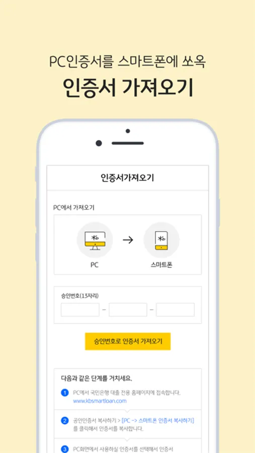 - iOS사용자의 경우 휴대폰에 있는 인증서를 직접 사용할 수 없으며 거래하시는 금융기관을 통해 인증서를 PC로 옮긴 뒤, KB스마트대출 PC홈페이지를 PC에서 접속하여 '공인인증서 복사하기'를 통해 이용이 가능합니다.