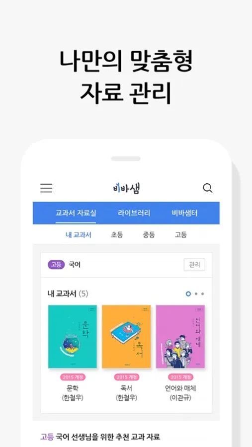 내가 설정한 조건에 맞추어 ‘나만의 추천 자료’를 만나보세요. 문서자료, 수업 PPT, 평가 자료, 멀티미디어 및 이미지 자료, 과목별 특화자료까지 비바샘이 든든한 초·중·고 수업을 책임집니다. 모바일 비바샘만의 특별한 기능! 최근 열람 자료 및 다운로드 자료도 함께 확인할 수 있습니다.