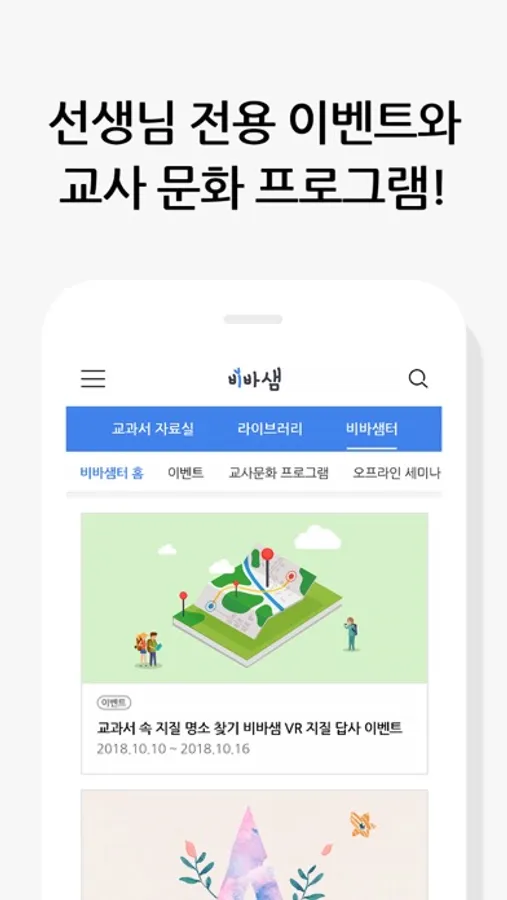 모바일에서도 이제 비바샘 이벤트와 특강을 신청할 수 있습니다. 매월 높은 인기를 자랑하는 선생님 전용 프로모션! 모바일 비바샘에서 더욱 빠르게 만나실 수 있습니다.