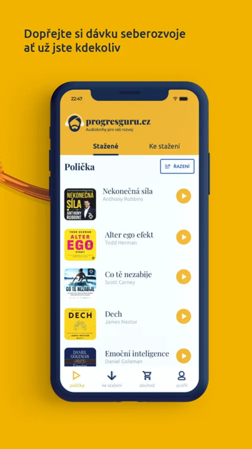 Věříme, že každý se může posunout dál. Proto vám přinášíme mobilní aplikaci, díky které můžete mít všechny audioknihy z našeho e-shopu Progres Guru u sebe a posouvat se tak dál kdekoliv a kdykoliv. Načerpejte inspiraci, podpořte kreativitu a namotivujte se, ať už vaše kroky směřují kamkoliv. Sbírejte moudra a bavte se.