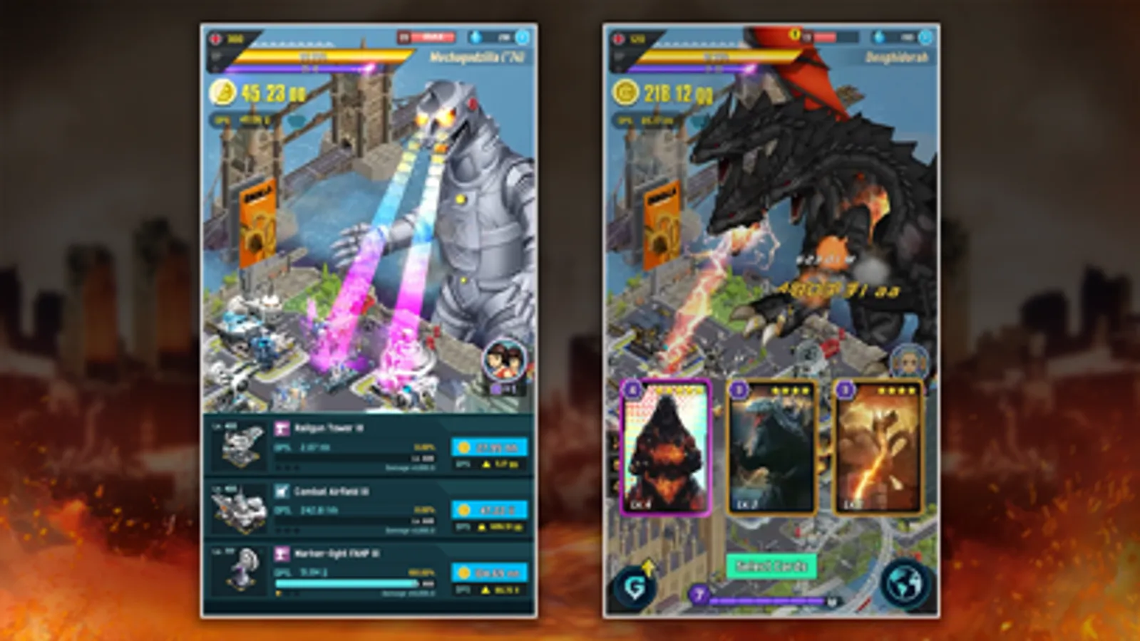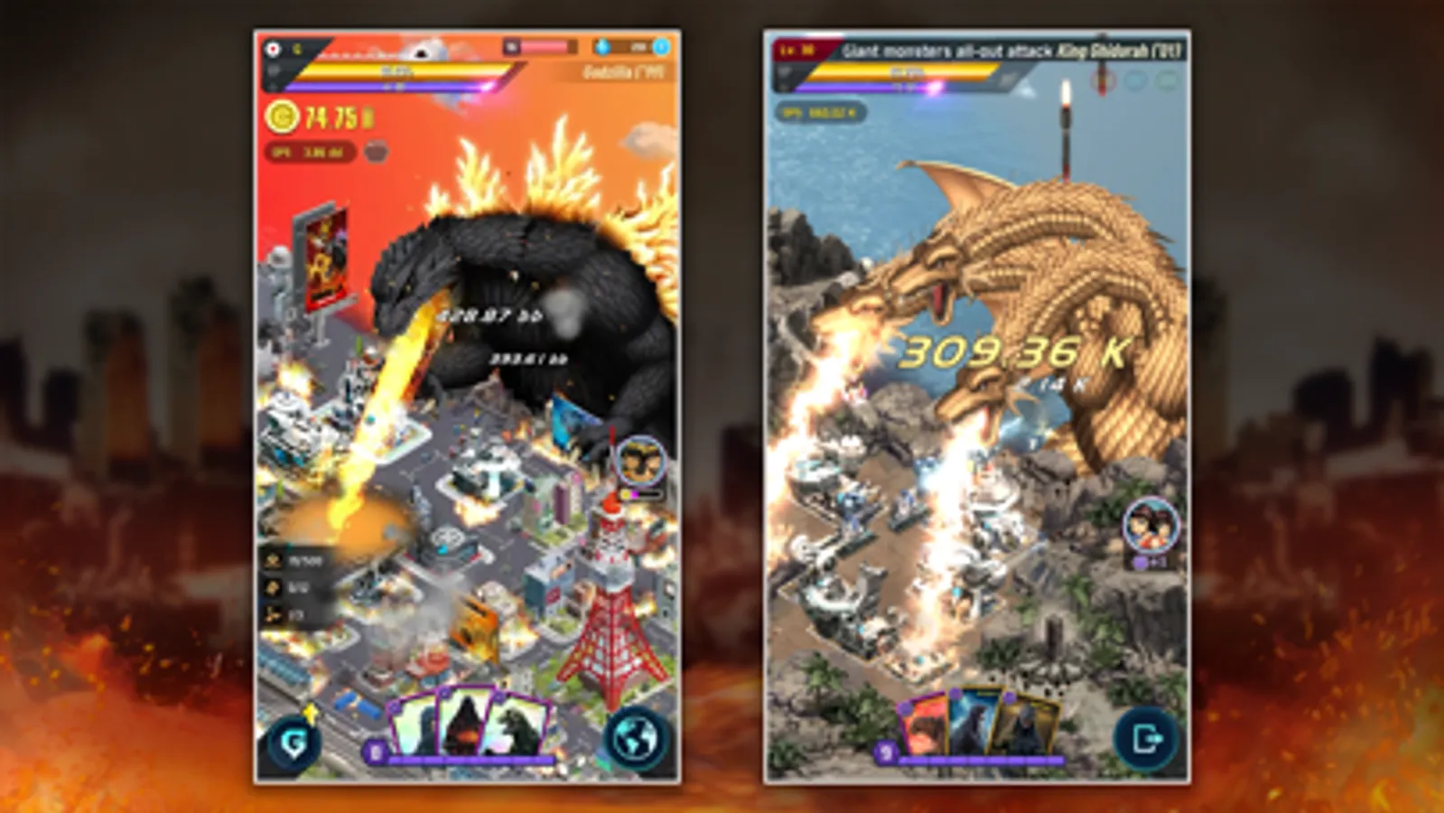 - Collect monsters and upgrade Godzilla Cards to summon Godzilla during the battle!