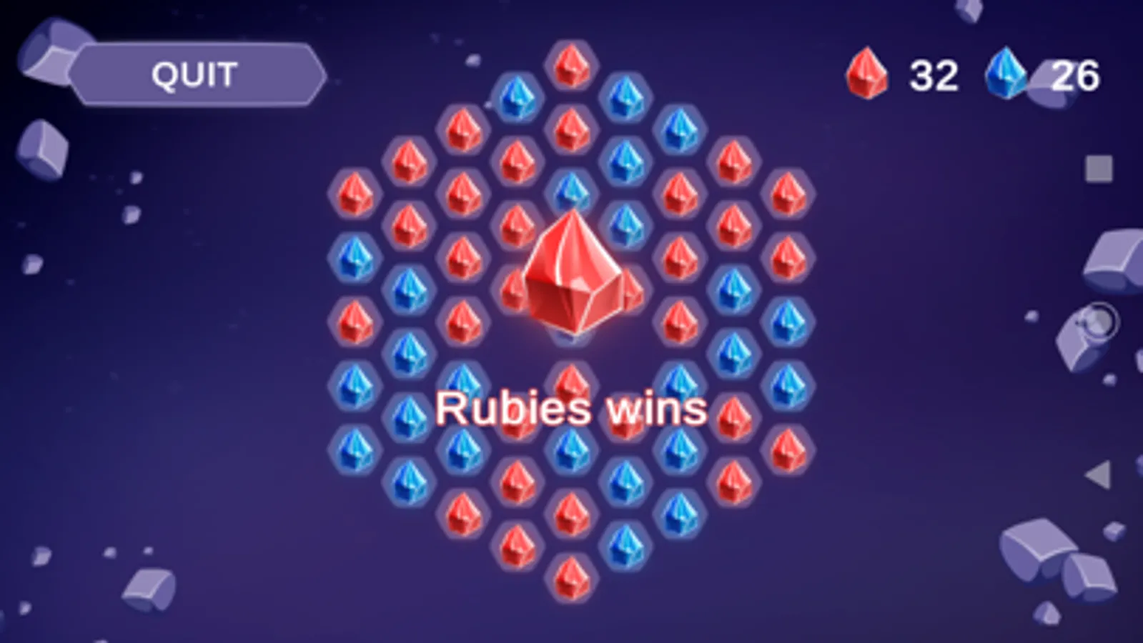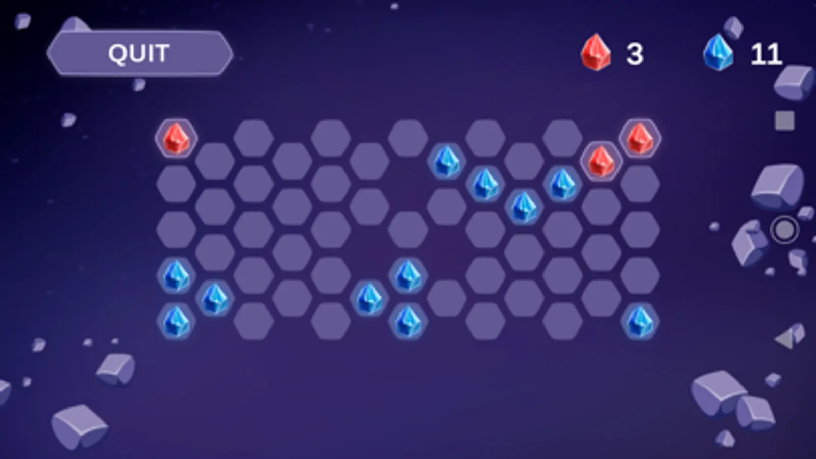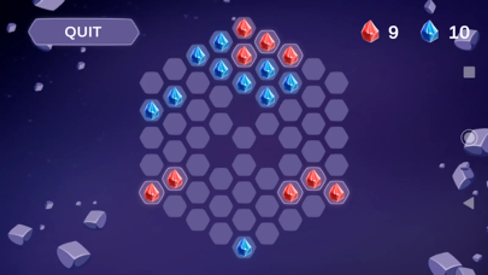 Your aim is to take over the board. Moving to neighboring hex will create a new gem. Jump through one hex will move your gem. Moving or jumping to a hex next to other player gems will transform them into yours!