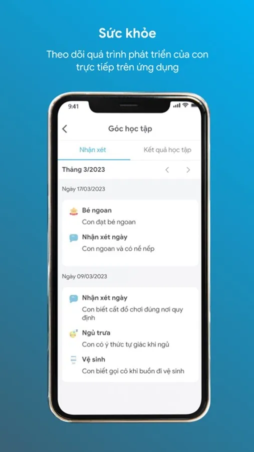 - Xem sức khoẻ gồm thông tin sự cố sức khoẻ của con mình, thông tin về các đợt khám sức khoẻ của con.