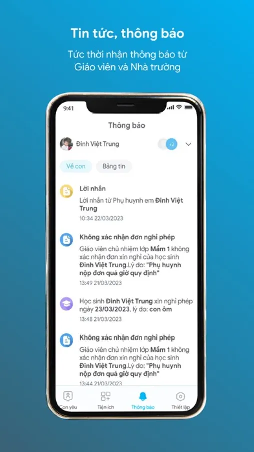 - Xem các thông tin rèn luyện của con mình. Bao gồm thông tin vào muộn, vắng mặt trong từng kì học và toàn năm học. Cho phép nộp đơn xin nghỉ cho con đồng thời quản lý các đơn xin nghỉ học của con.