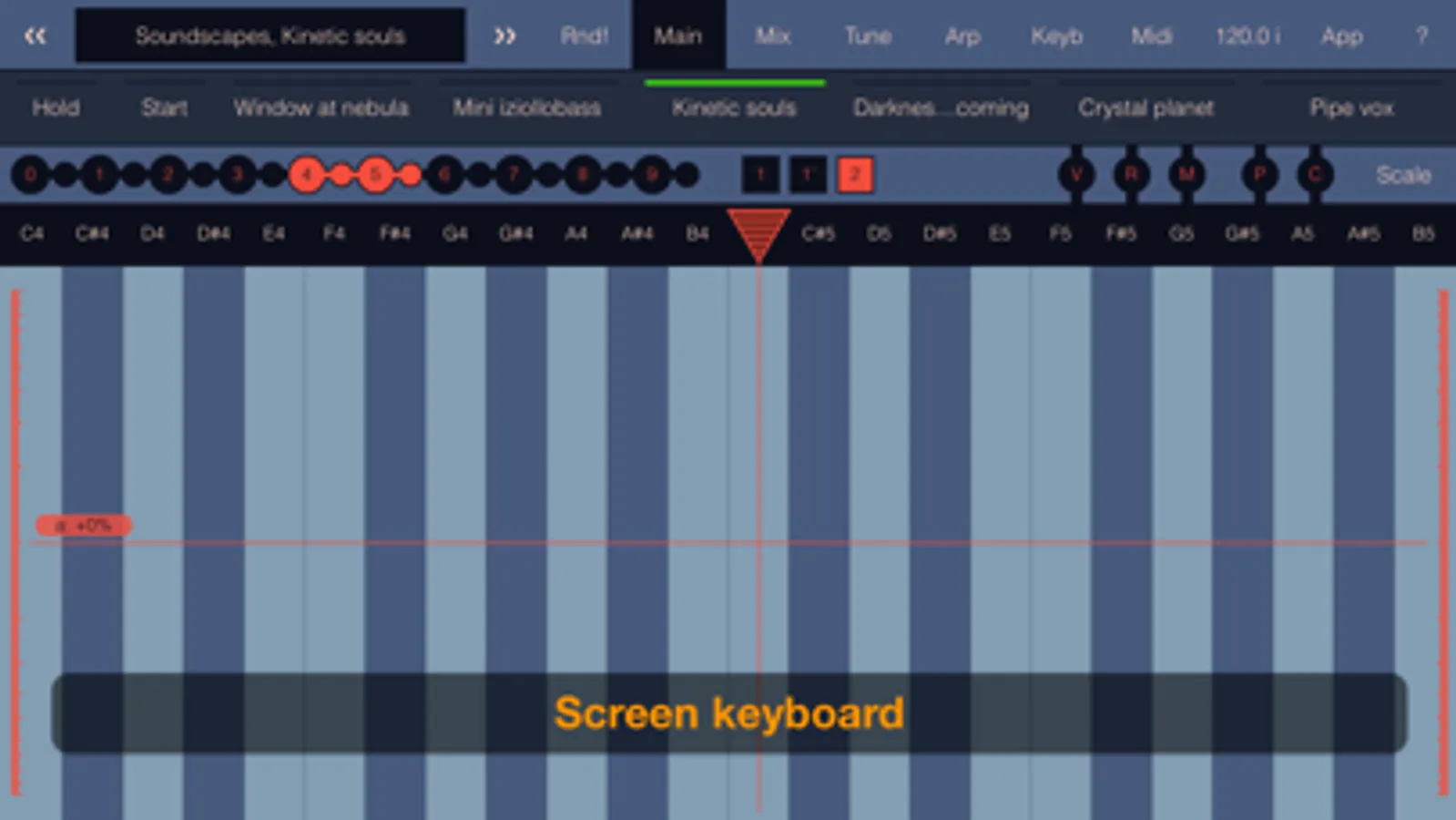 The screen keyboard in addition to standard use has a special mode that turns it into a continuous area in which you can smoothly change the tone separately for each touch. This is ideal for creating a variety of soundscapes, drones and textures. The screen keyboard also has a simulation of velocity, adjustment of pitch and the rate of modulation, as well as a scale editor with a built-in list of scales.