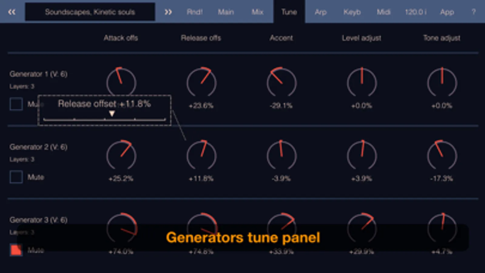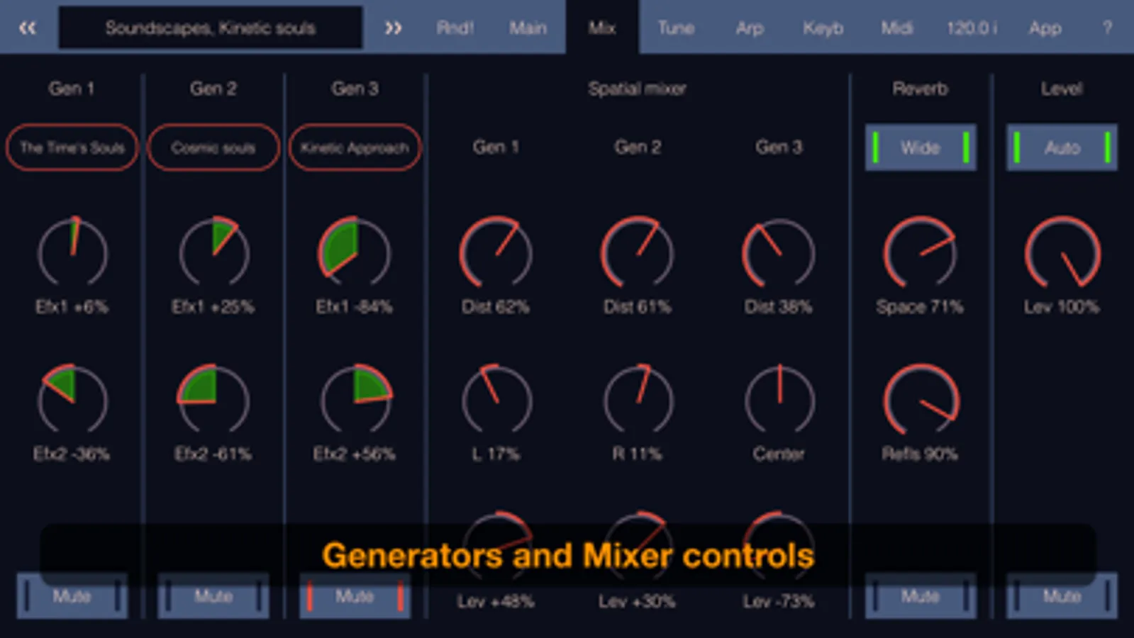 You can tune the general parameters that define the character of the sound of each generator and place them in a common sound space with the spatial mixer.