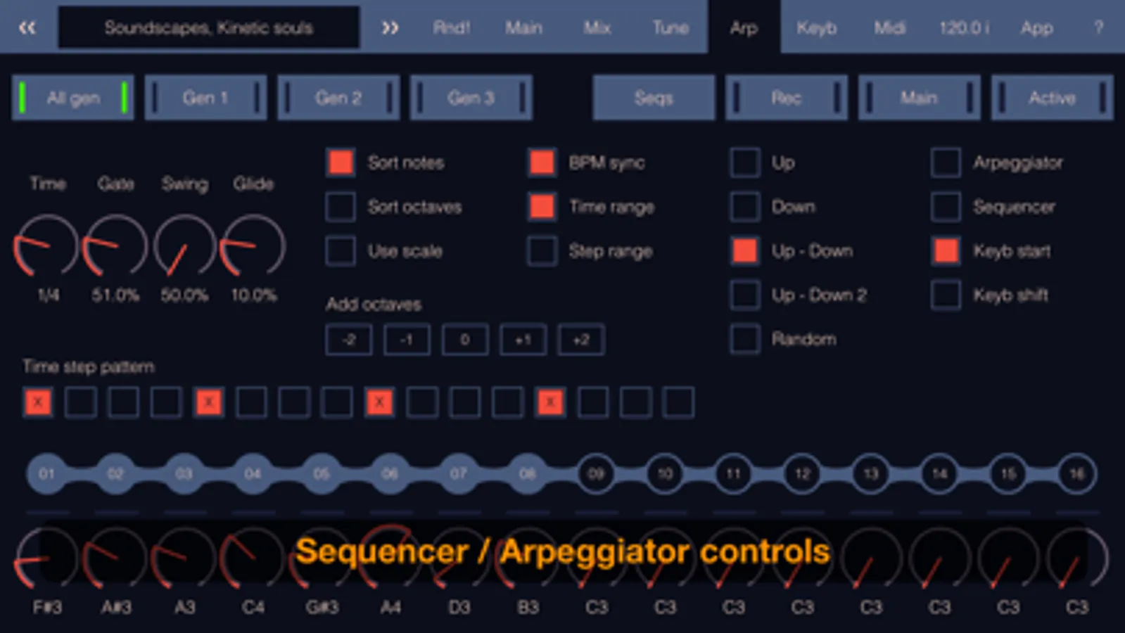 Each sound generator has its own sequencer / arpeggiator, so you can create a common sequence for all generators or separate sequences for each. Many different modes allow you to turn even the simplest sequence into a continuously varying melody changing just by pressing a single note. You can also record a sequence from the keyboard or copy it from other scenes.