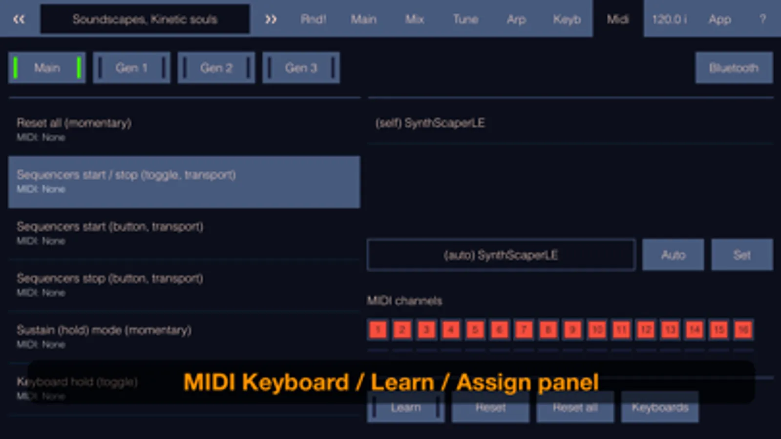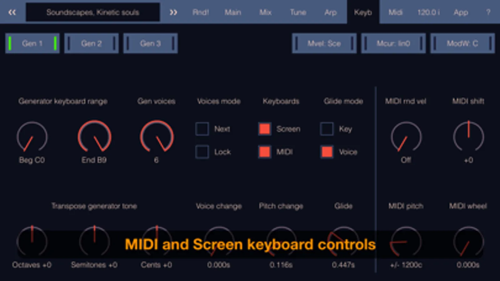 SynthScaper LE fully supports MIDI keyboards and controllers and can assign external MIDI controls to almost all parameters. You can assign sound generators to different ranges on your MIDI- and on-screen keyboard, and even only to MIDI or only to the screen keyboard. In addition, this app can auto detect the type of MIDI keyboard and automatically use extended controls such as knobs and buttons. For a list of supported MIDI keyboards and assigned controls see the app description.