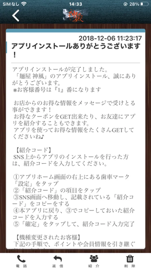 麺屋 神風のアプリをSNSを通じてお友達に紹介する事ができます。