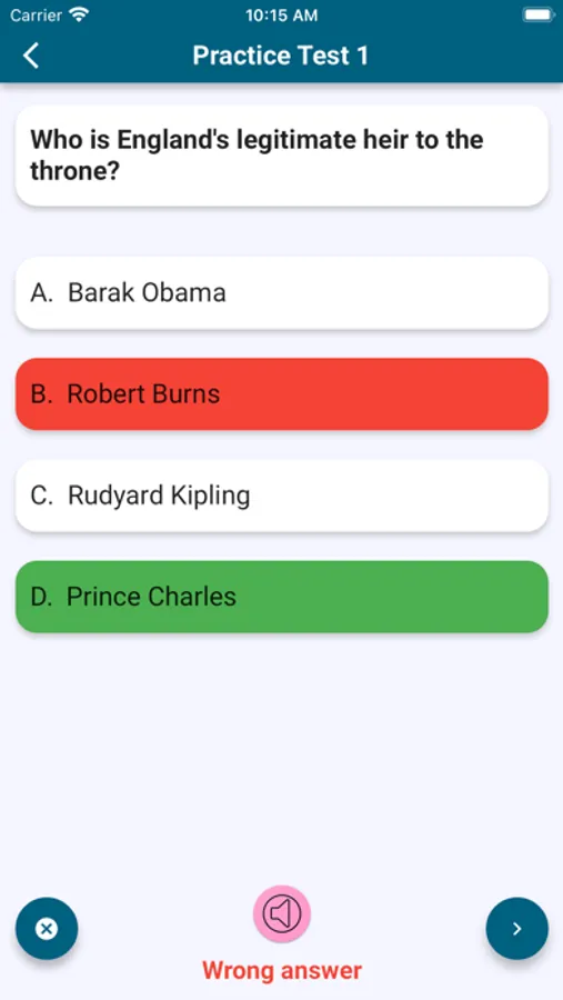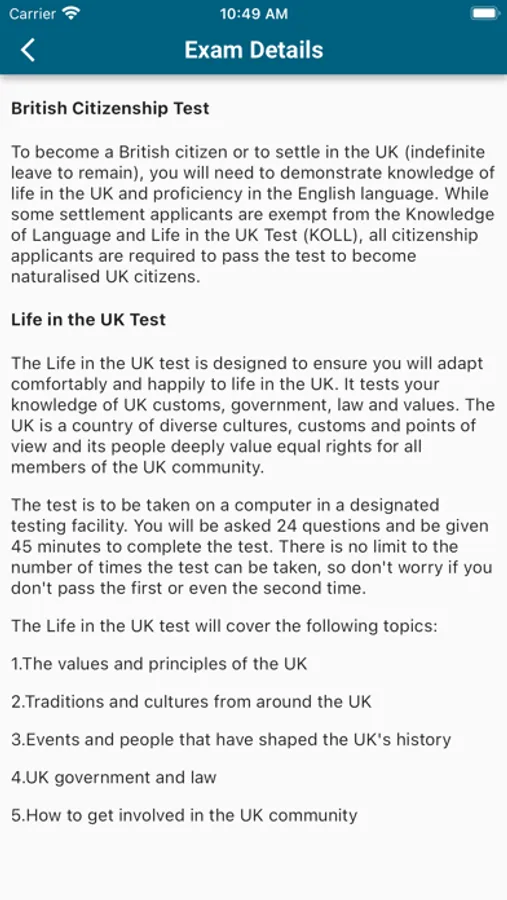 The best FREE app for you to prepare for your Life in the UK test. It is very simple to use. You can take the practice test in any places wherever you are. There are 24 questions in each test. You must answer 18 questions or more correctly to pass the test.