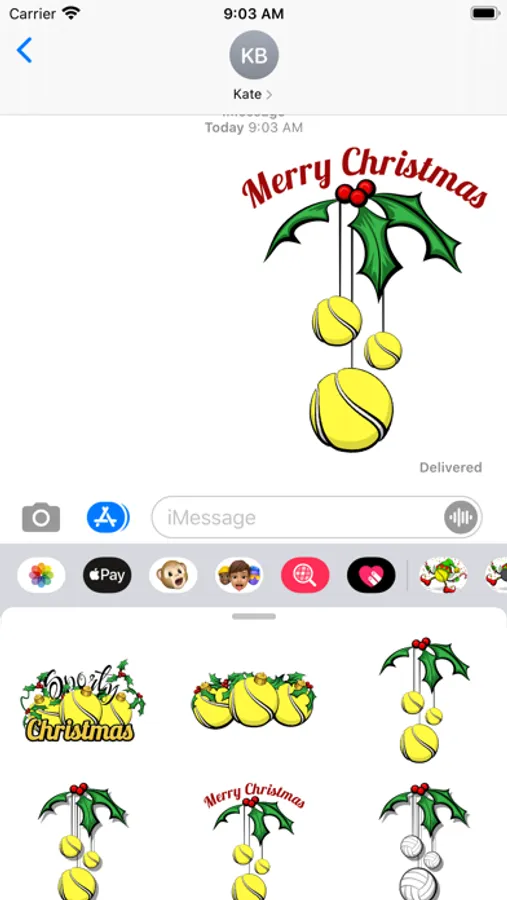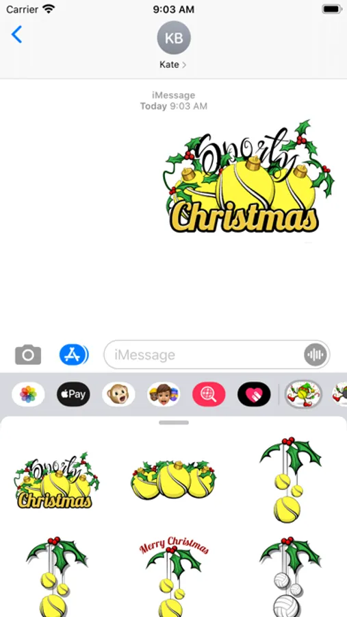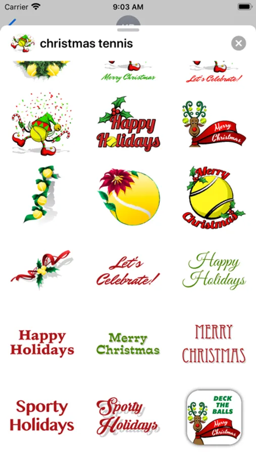 A set of Christmas holiday tennis stickers. Set includes an animated dancing elf tennis ball.