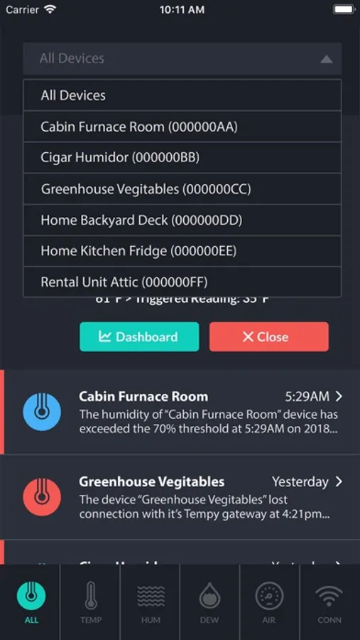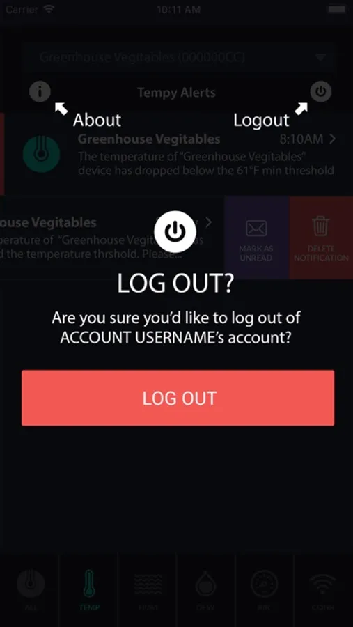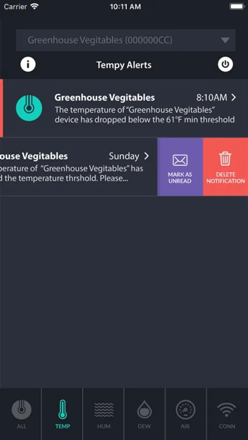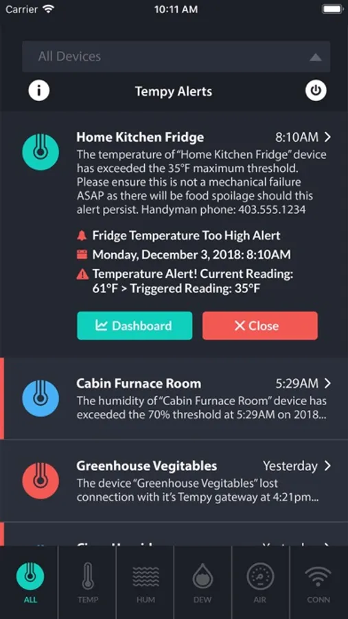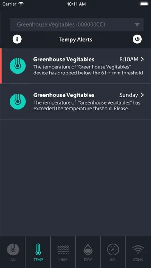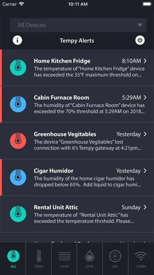 Tempy Alerts is a mobile push notification app that monitors your Tempy sensor(s) alert that have been created and triggered through the Tempy web application. Once connected to your existing Tempy web application account, you will receive temperature, humidity, dew-point, air-pressure, and connection loss notifications instantly from anywhere in the world. The Tempy Alerts app gives you the ability to filter alerts by a sensors name, as well as by the type of alert that was triggered. The Tempy Alerts app must be associated with an existing Tempy web application account, which is created upon receiving your Tempy system hardware in order to register and manage your wireless sensors.