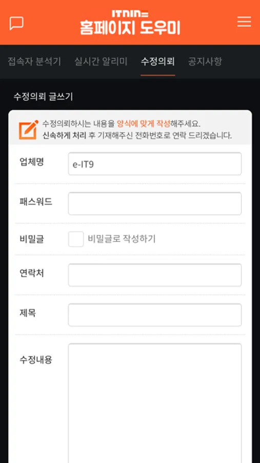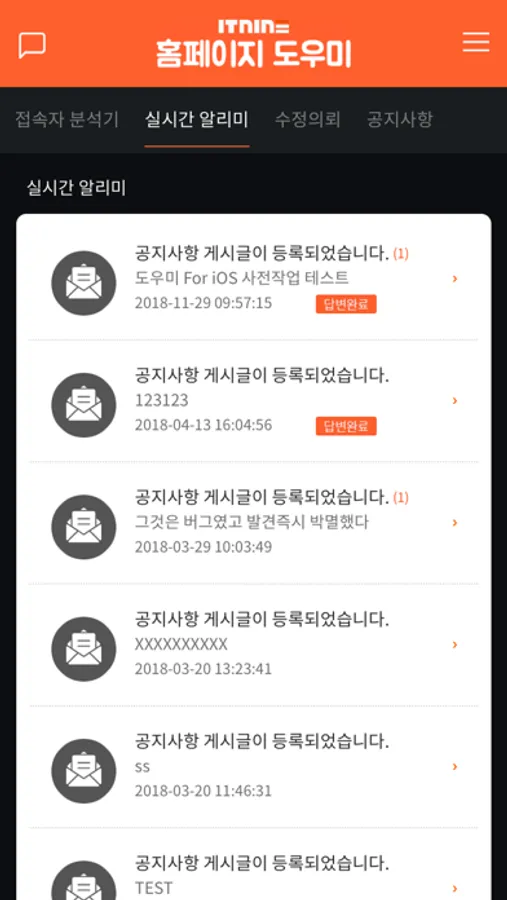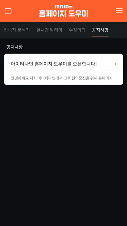 아이티나인에서 제작/관리하는 홈페이지의 게시글, 실시간문의를 앱을 통해 관리하실 수 있습니다