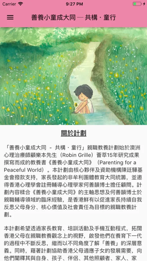 〈善養小童成大同 - 共構 ‧ 童行〉親職教養計劃由發展夥伴及捐助機構陳廷驊基金會撥款支持,計劃始於一本由澳洲心理學家Robin Grille 顧樂本撰寫的教養書Parenting for a peaceful world (中譯本《善養小童成大同》)的主軸思想,是香港鮮有以促進家長持續自我反思父母身份、核心價值及社會責任為目標的親職教養計劃。