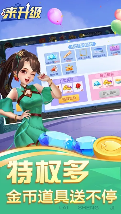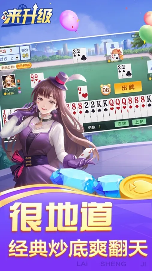 【画面精】华丽特效,丰富表情,视觉效果耳目一新" "升级,又称为“拖拉机”,”八十分(80分)”,“炒地皮”,“双升”,”双扣”,”五十K”等,是一款风靡全国的经典扑克牌游戏。升级拖拉机牌局采用四人组队抢分升级的游戏模式,超炫酷的动画搭配刺激炒底的玩法,在原有规则上还增加了五主过河玩法,让你玩到停不下来!游戏包含了经典、炒底、连打、五主过河等多种玩法。