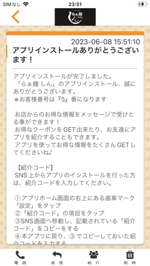 らぁ麺しんのアプリをSNSを通じてお友達に紹介する事ができます。