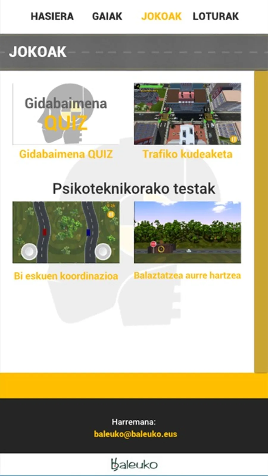hainbat bideo daude. Jokoak atalean 4 joko daude: Gidabaimena quiz edo gidabaimena