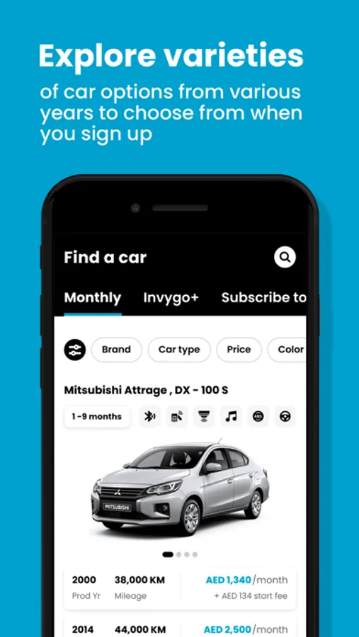 The monthly fee covers maintenance, insurance, 24/7 roadside assistance, mileage, and delivery. Stop wasting time and enjoy the best deals in town on high-quality cars. Download the invygo app and hire a car now!