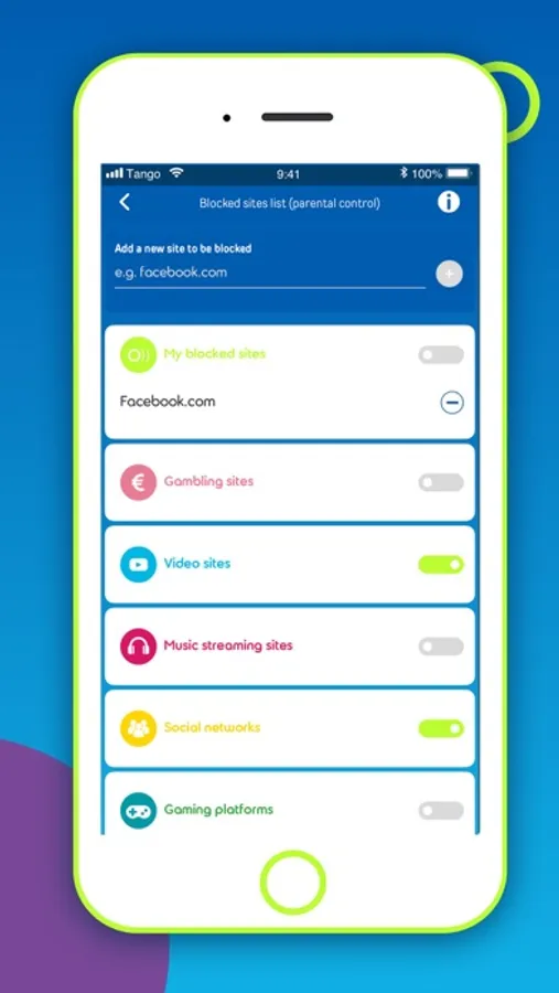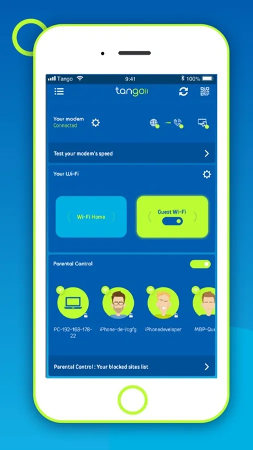Take things further and control your private and guest Wi-Fi networks, share them or restrict access to them. Once you are connected to your Tango FRITZ!Box, the My Tango Wi-Fi app will allow you to: