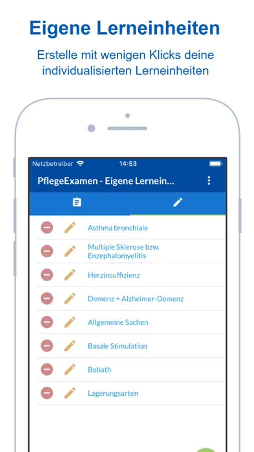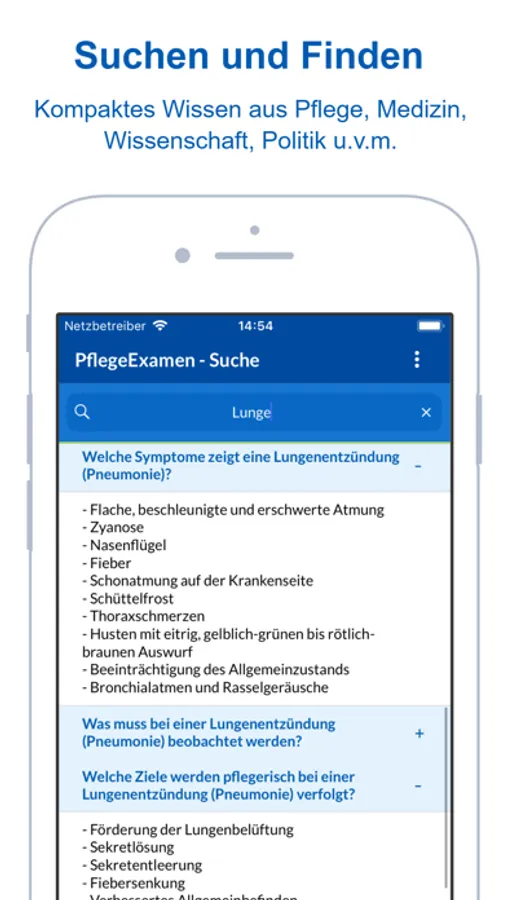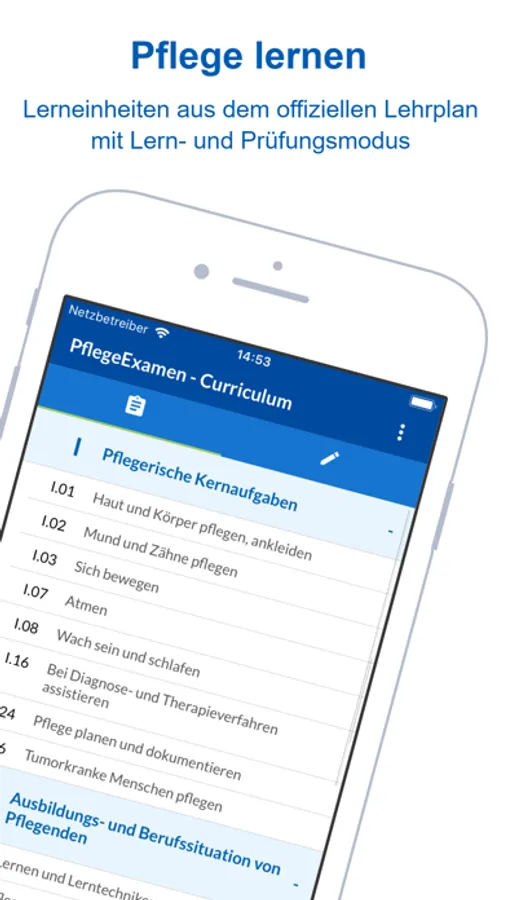 Pflegerisches und medizinisches Wissen ändert sich stetig. Dementsprechend ist die Datenbank der App stetig am wachsen, wird erweitert, gepflegt und an den neuesten wissenschaftlichen Erkenntnissen regelmäßig angepasst. Aktuell sind 18 Lerneinheiten aus den Ausbildungsrichtlinien NRW (985 Aufgaben):