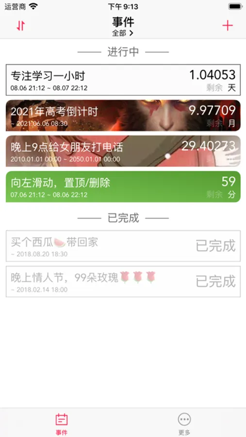 - 支持不同维度的提醒,通过推送通知提醒您即将到期的事件