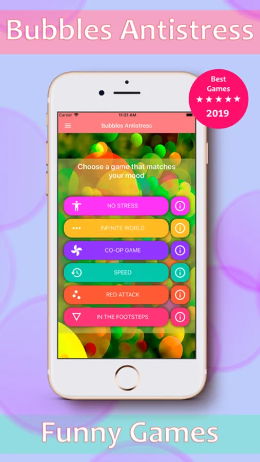 1. NO STRESS is a relaxing game with out of 7 very long levels. You just burst the bubbles and go to the next level. Each level has its own color shade.
