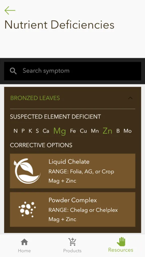 indications on usage, dosage rates and growth stages for a list of crops. The Nutrico App also make general reference to certain abnormal growth conditions usually brought forth as result of certain nutrient deficiencies. For these general descriptions of abnormal growth, the Nutrico App try to provide corrective recommendations with options by using Nutrico products. Calculations to provide accurate use of water conditioning agents are also included to assist farmers when planning to use these