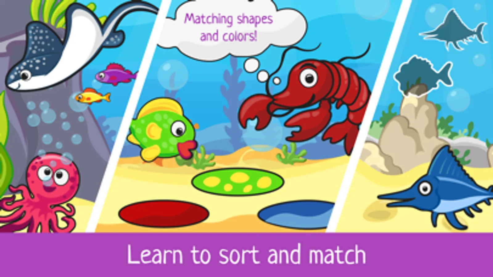 The puzzle game is easy for kid: large contrasty animal shapes are confortable for drag -n- drop. Just make a fish to it's shadow - pretty simple. Our shapes game include funny music that toddlers likes. It will be good to cheer up your baby! :D