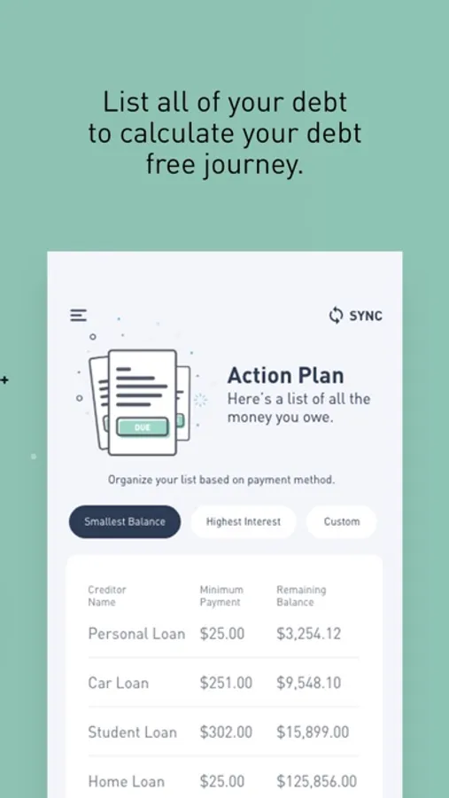 Enter in your debt and the app will create a debt free plan. This plan will give you a timeline for car loan payoffs, credit card payoffs, student loan payoffs and mortgage payoffs. Track your monthly progress by recording your payments allowing you to view how much your journey has changed.
