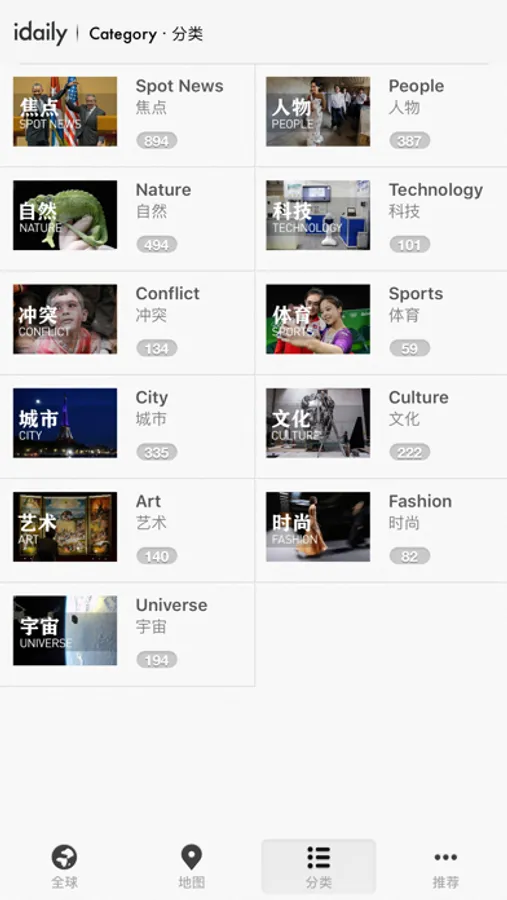 4.分类 & 地图:11个领域类别,六大洲、南北极、外太空浏览